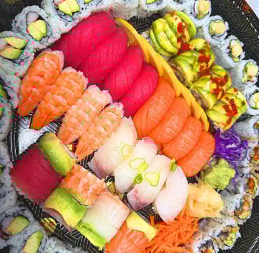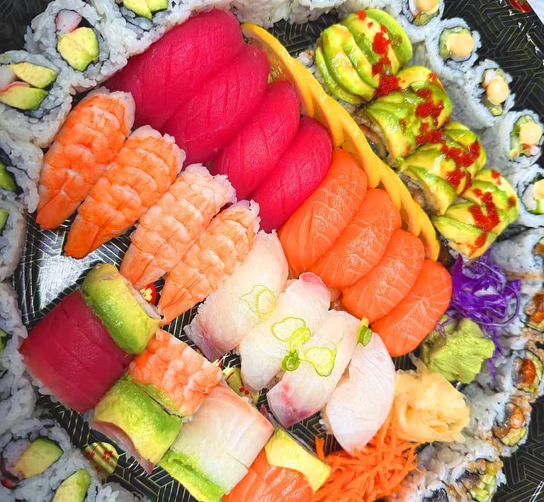 Salmon, Tuna, Shrimp, Redsnap Nigiri Each 4 Pieces, Plus 5 Classic Rolls And 2 Special Rolls.