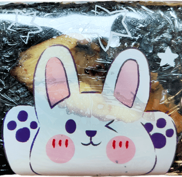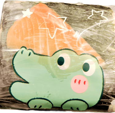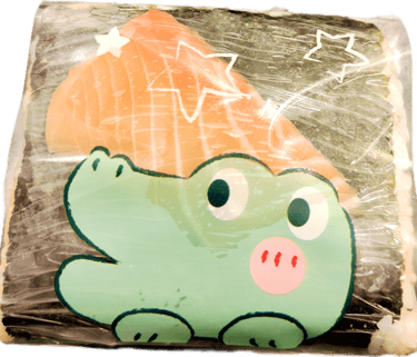 A seaweed-wrapped sesame rice ball topped with a slice of grill salmon. Inside with fresh grill salmon and Avocado with spicy mayo and chef's special sauce.