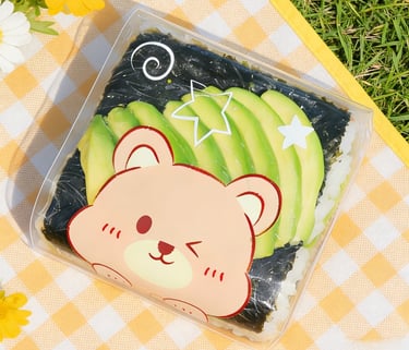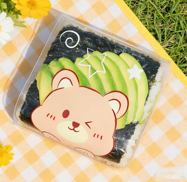A seaweed-wrapped sesame rice ball topped with a slice of avocado. Inside with fresh avocado, spicy mayo and chef's special sauce.
