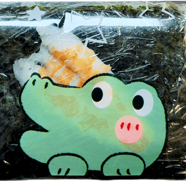 A seaweed-wrapped sesame rice ball topped with a slice of shrimp. Inside with fresh shrimp and Avocado with spicy mayo and chef's special sauce.