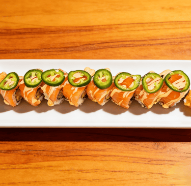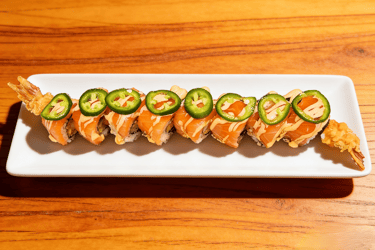 Crab meat, shrimp tempura topped with salmon, jalapeno and chef special sauce.