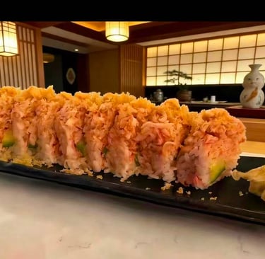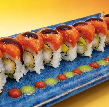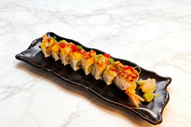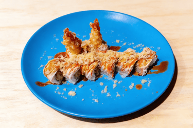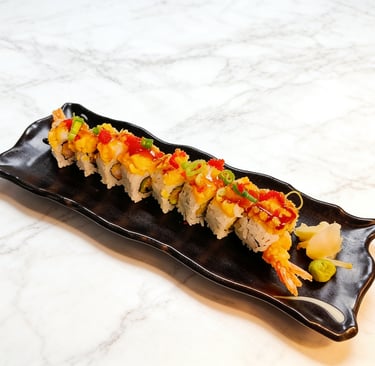Shrimp tempura, avocado, crab meat, topped with double shrimp tempura tobiko, scallion, crunchy, spicy mayo and eel sauce.