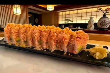 Shrimp tempura, cream cheese, avocado topped with spicy crab meat and crunchy.