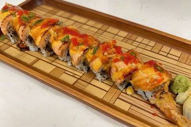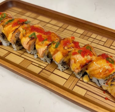Shrimp tempura, avocado, crab meat topped with baked salmon, scallion, spicy mayo and eel sauce.