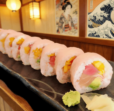 Tuna, salmon, eel, avocado, mango, crab meat wrap with pink soybean paper.